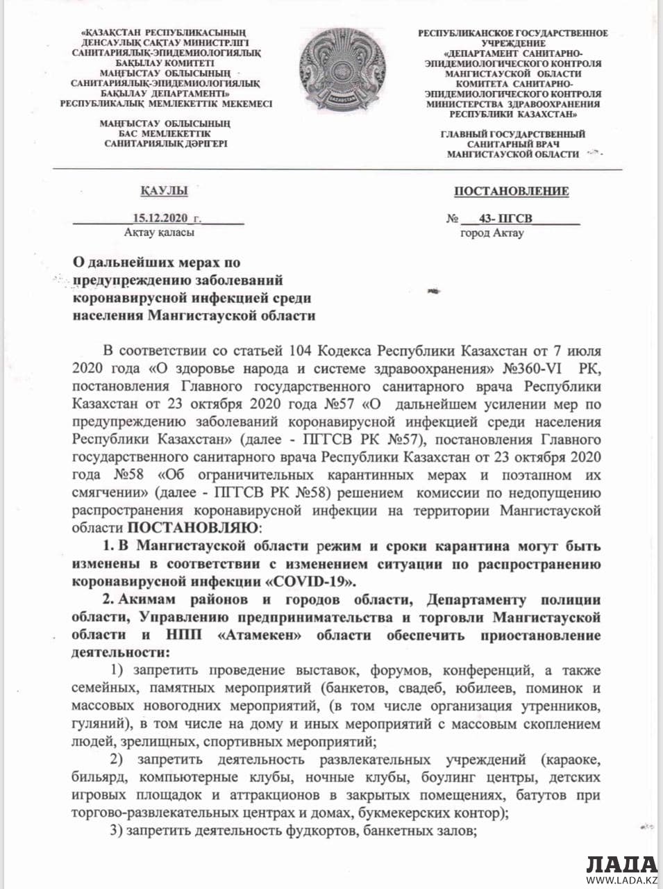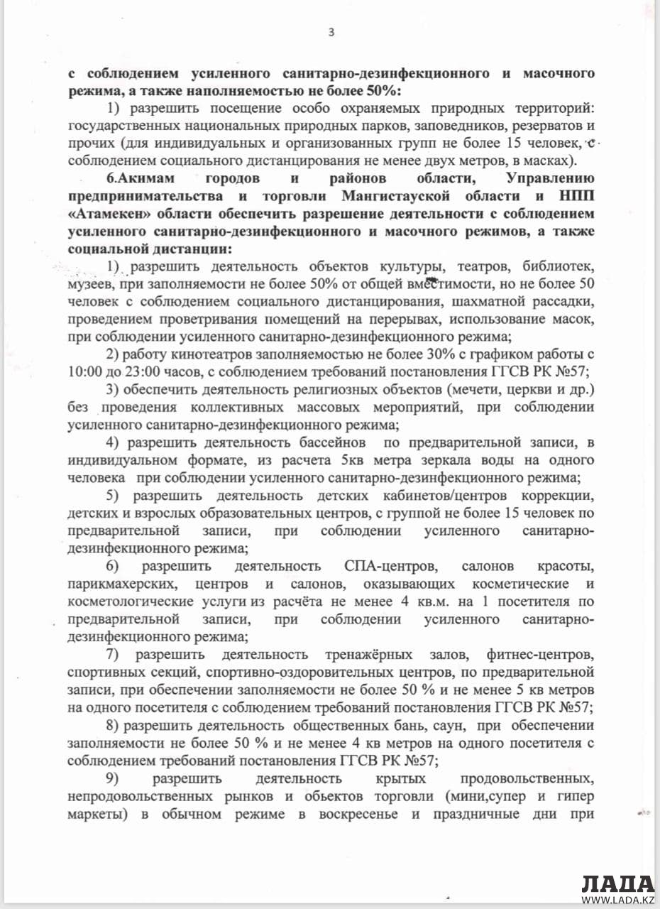 Согласно постановлению главного санитарного врача Мангистауской области, торгово-развлекательным центрам (ТРЦ) и рынкам Мангистауской области в праздничные и выходные дни разрешили работать в обычном режиме.