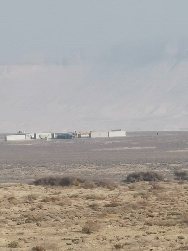 Вчера, 31 января, путешественник сфотографировал спецтехнику с рабочими на холме в четырех километрах от «клыков» урочища Бозжыра.