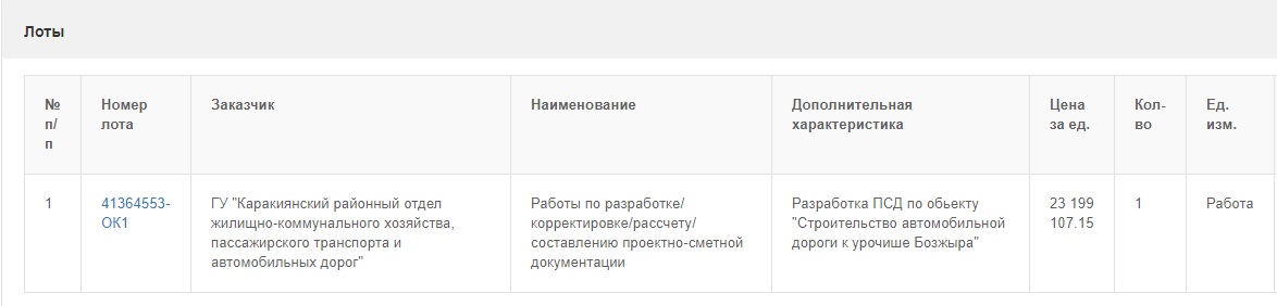 - Наименование – разработка ПСД по объекту «Строительство автомобильной дороги к урочищу Бозжыра». Плановая сумма – 23 199 107.15 тенге, - указано в технической спецификации к конкурсу.