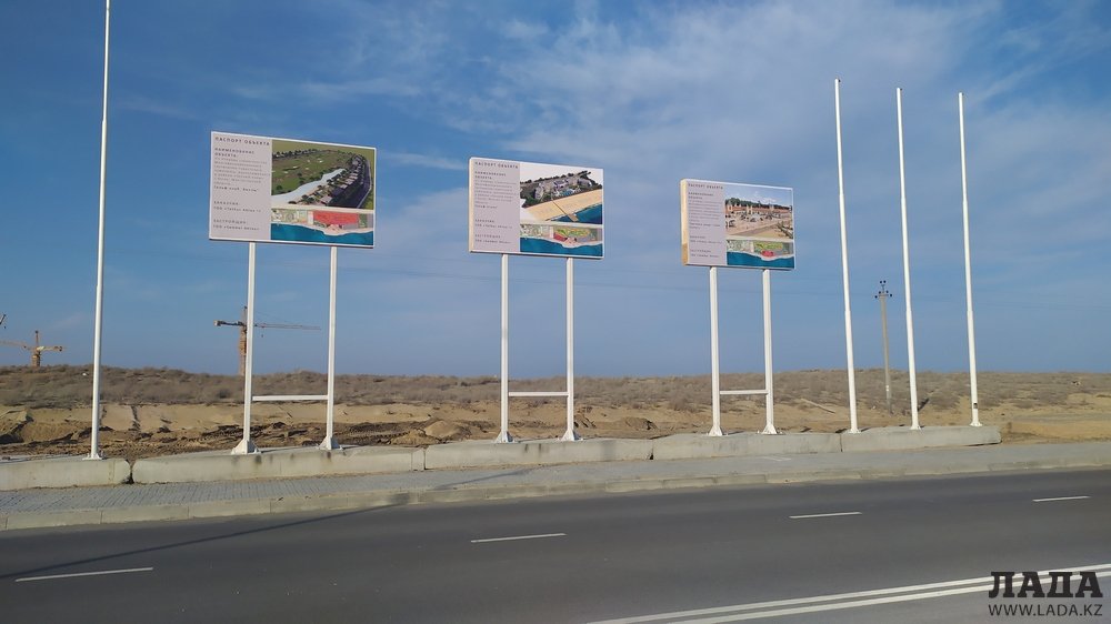 У главной дороги уже установили билборды с паспортами объектов. Согласно описанию в них, в скором времени на этой территории появятся торговые ряды «Town center», гольф-отель и гольф-клуб с виллами.