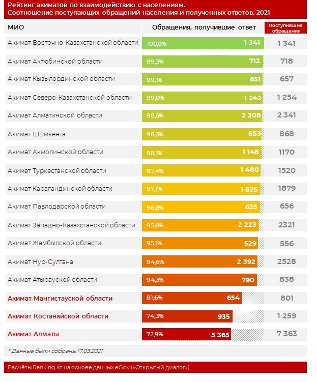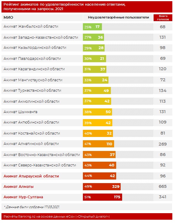 - Сам по себе ответ МИО на обращение населения не означает, что обратившийся гражданин ответом удовлетворён, и его проблема была решена. Ответ может быть формальным или не соответствующим запросу. Поэтому мы составили рейтинг по удовлетворённости населения полученными ответами, - пояснила в своей публикации команда Ranking.kz.