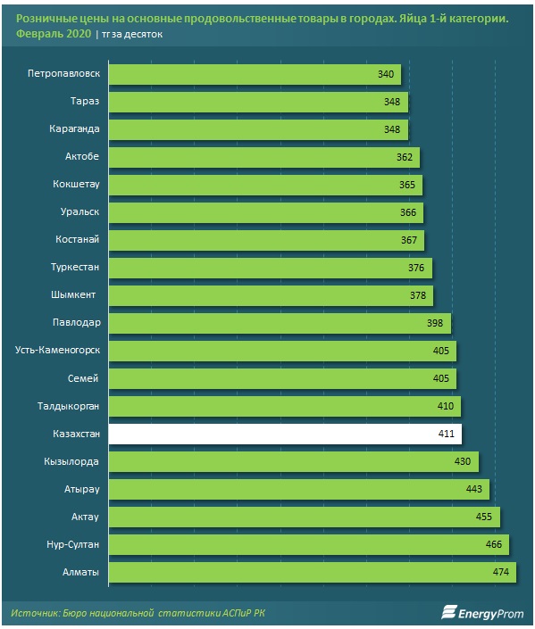 портал, составила 455 тенге. Дороже всего яйца обходились алматинцам (474 тенге за десяток). На втором месте Нур-Султан- 466 тенге. Дешевле всего яйца обходятся жителям Петропавловска - 340 тенге за десяток.