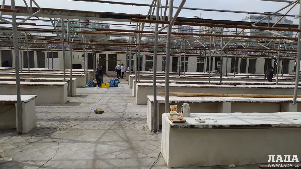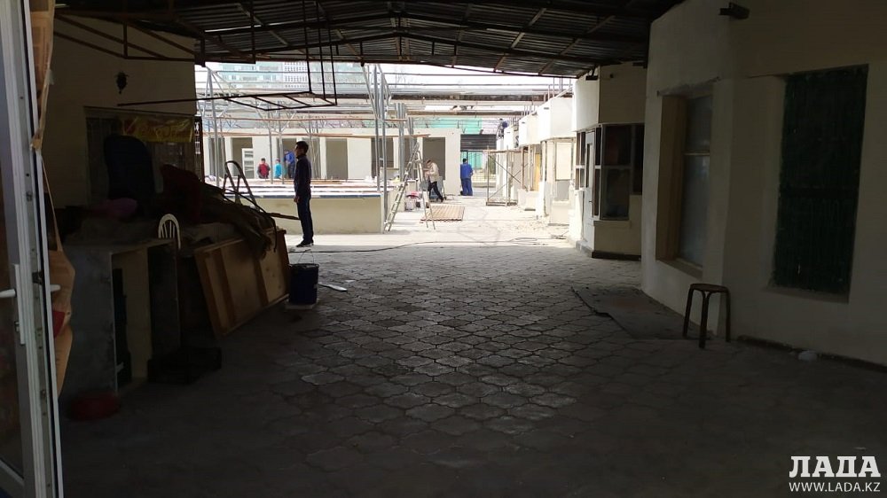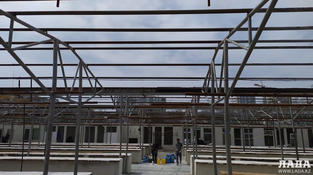 На рынке «Волна» в 5 микрорайоне Актау идут ремонтные работы. На данный момент рабочие уже восстановили прилавки и опоры для крыши.