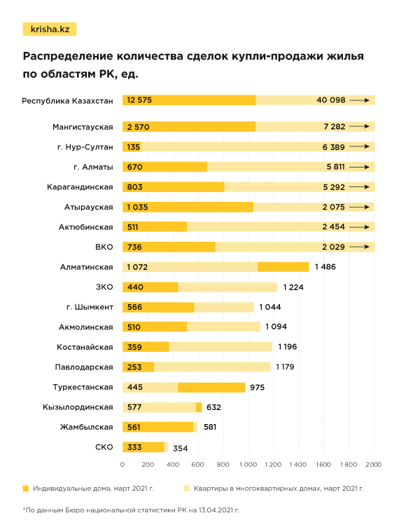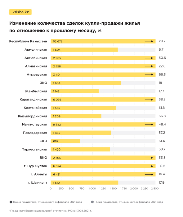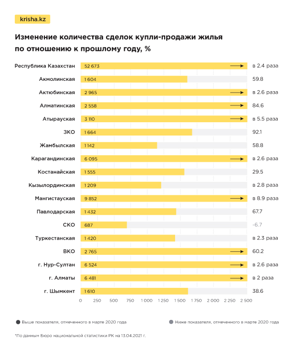 Относительно марта 2020 года количество сделок в РК выросло в 2,4 раза.