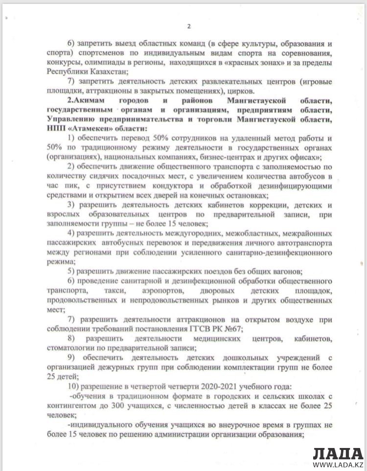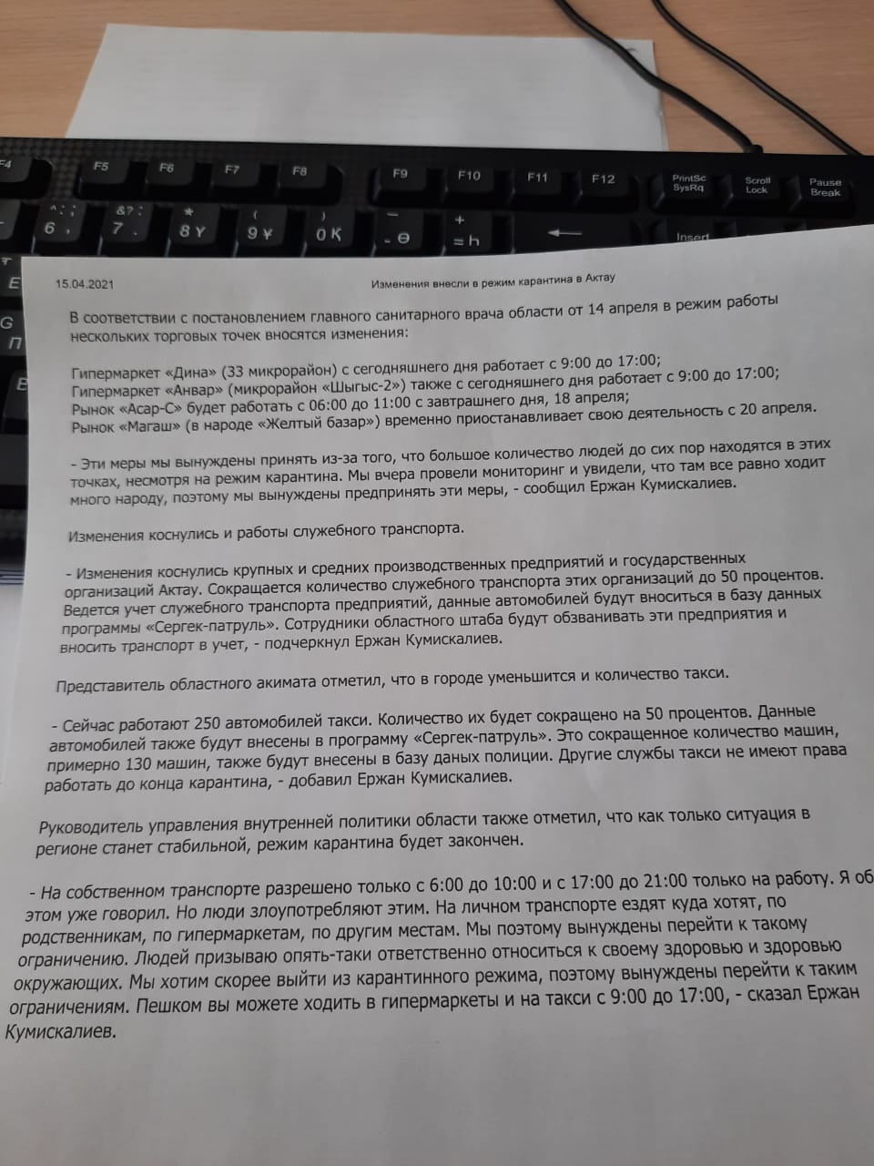 - Эта бумага не имеет никакого отношения к последнему постановлению санитарного врача региона. Об ограничениях в текстовом документе указана речь бывшего руководителя управления внутренней политики региона, который на этой должности уже не работает. Достоверное постановление Газиза Надуева опубликовано во всех новостных изданиях региона и на официальных сайтах госучреждений, – сообщили в акимате Мангистауской области.