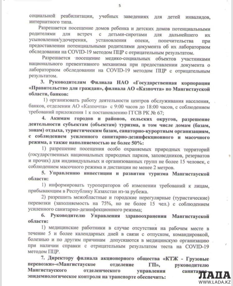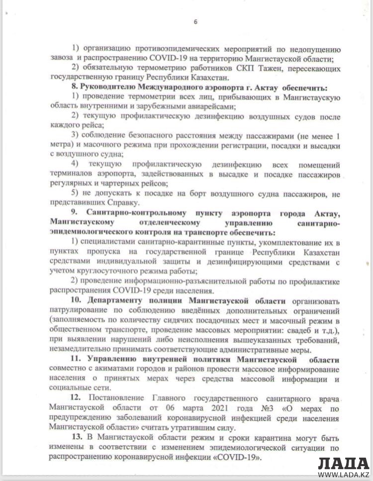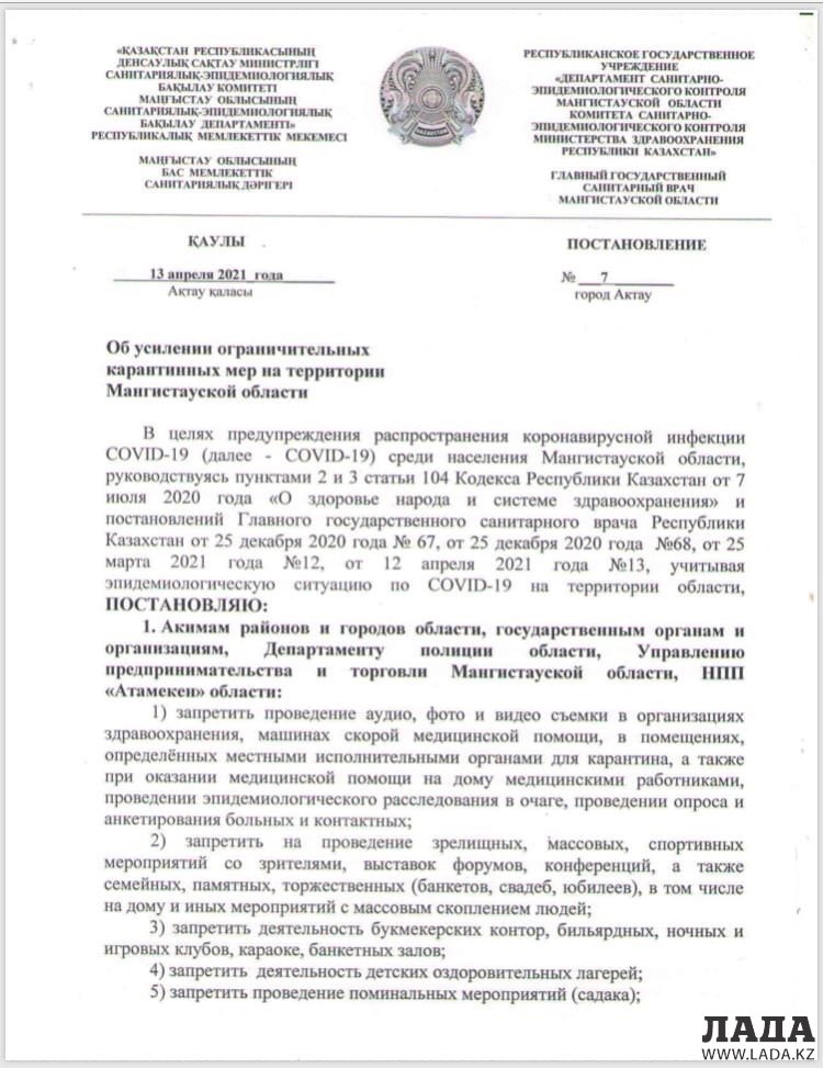 А вот второй распространяемый в сети документ, действительно, является последним постановлением санитарного врача Мангистауской области, которое было