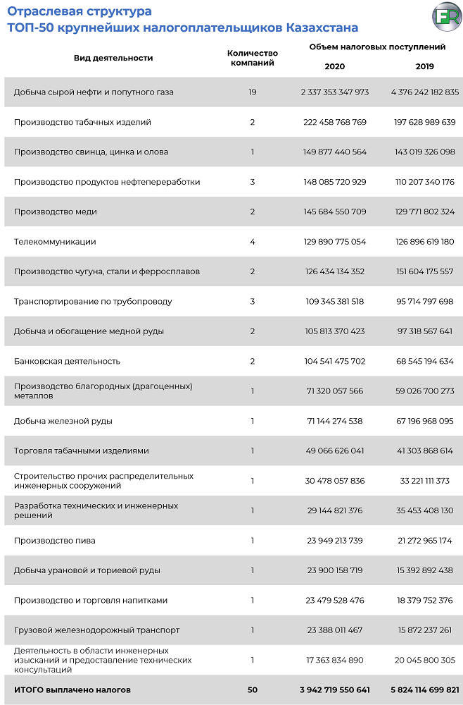 За прошедший год в общей сложности в государственный бюджет поступило 8,6 триллиона тенге. Пятьдесят крупнейших налогоплательщиков выплатили в общей сложности 3,9 триллиона тенге.