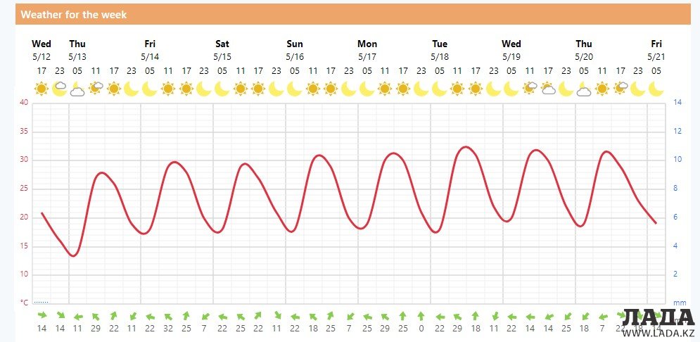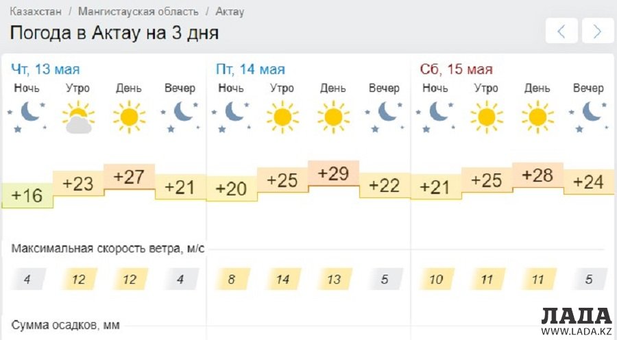 Ну а прогноз погоды на Weather today сообщает о повышении температуры в Актау до +30 градусов 13 мая и до +32 градусов 14 мая.