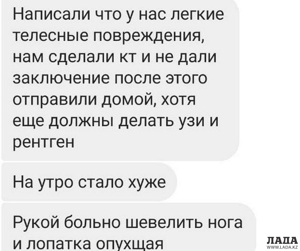 - После аварии ему сделали КТ головы, но не осмотрели голову, хотя там была рана головы. Рентген грудной клетки в первый же день не делали, УЗИ брюшной полости тоже, несмотря на то, что он жаловался на боли. Мы пришли на следующий день из-за того, что у него начались сильные боли. В больнице ему сделали рентген ноги, локтя и грудной клетки. Отдали снимок, но не дали заключение. Результаты КТ тоже не дали. Сказали, что якобы всё хорошо. На третий день пришли разбираться, потому что становилось хуже и хуже, голова болит, давит на глаза, и нам только тогда уже сказали, что у него гематомы в голове, и назначили лечение, – жалуется супруга пострадавшего мужчины.