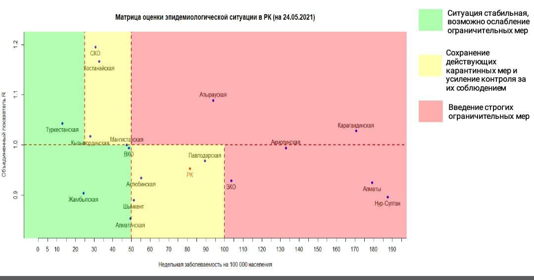 Об этом свидетельствуют данные матрицы оценки эпидемиологической ситуации в регионах Казахстана на 24 мая.