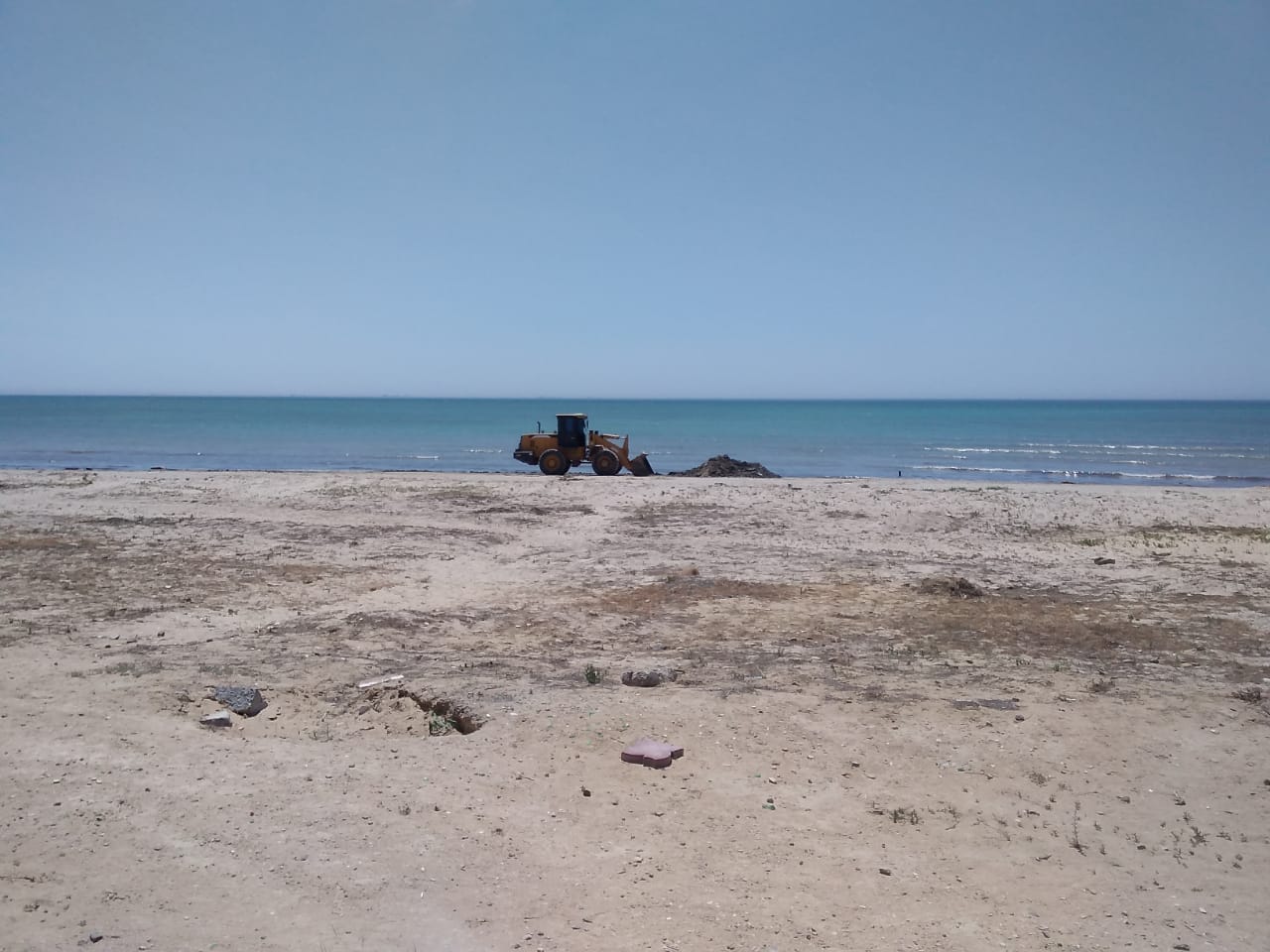 В Сети появились фотографии, на которых при помощи спецтехники проводится уборка на городском пляже в 1 микрорайоне Актау.