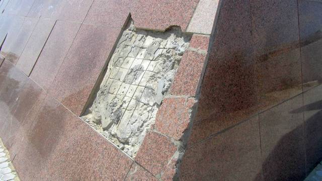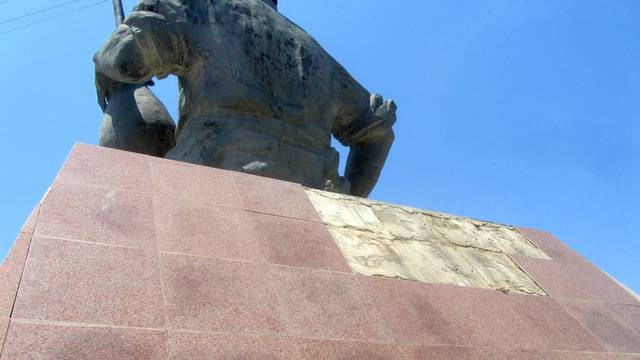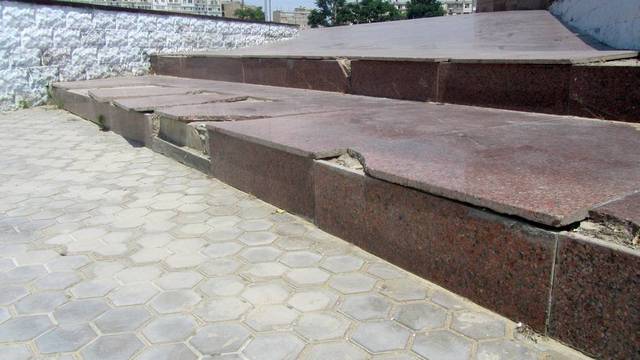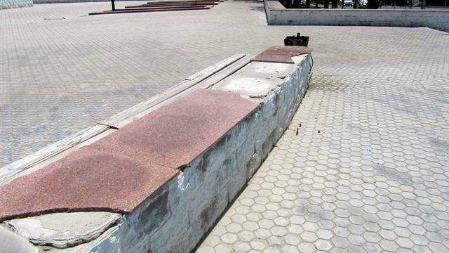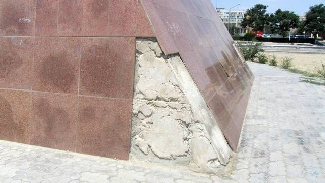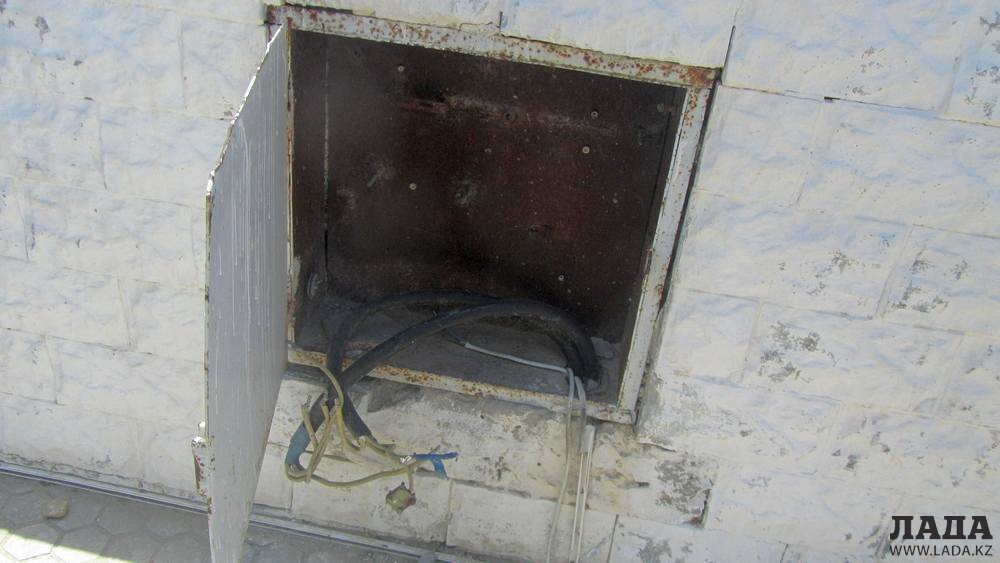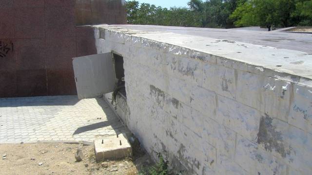 Кроме этого, за памятником располагается электрощиток, дверца которого открыта. Из него торчат оголённые провода.