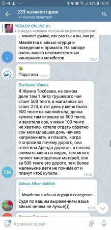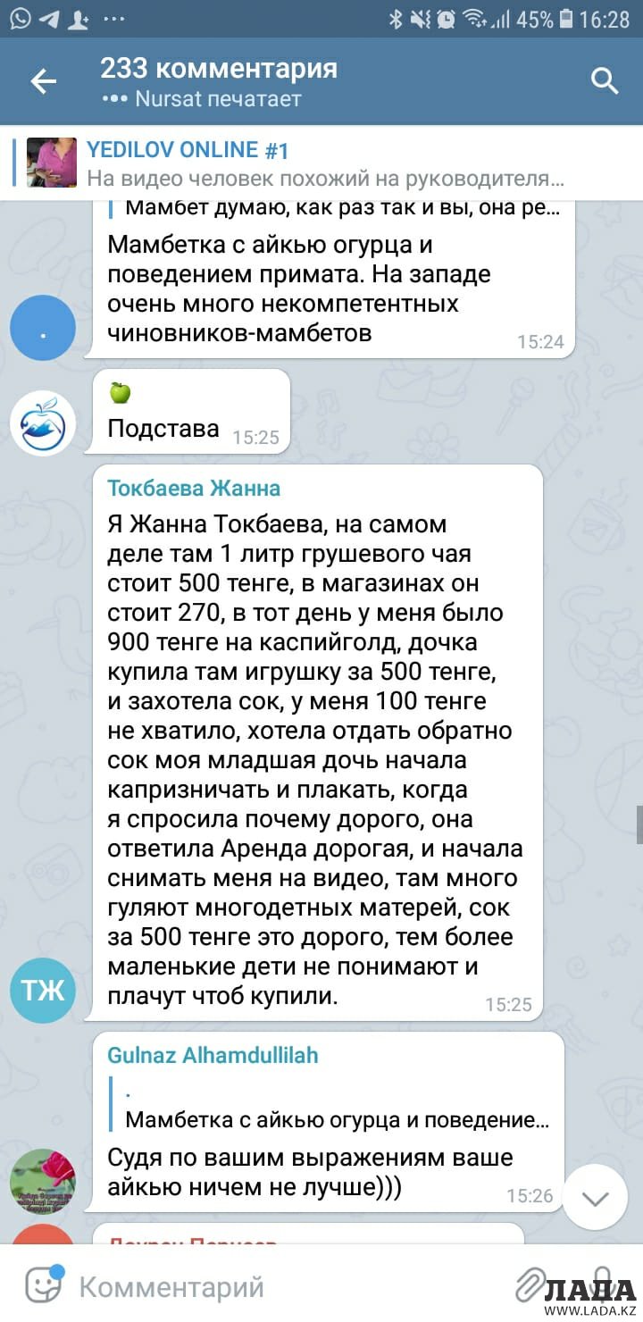 «Я Жанна Токбаева, на самом деле там 1 литр грушевого чая стоит 500 тенге, в магазинах он стоит 270, в тот день у меня было 900 тенге на каспийголд, дочка купила там игрушку за 500 тенге, и захотела сок, у меня 100 тенге не хватило, хотела отдать обратно сок моя младшая дочь начала капризничать и плакать, когда я спросила почему дорого, она ответила Аренда дорогая, и начала снимать меня на видео, там много гуляют многодетных матерей, сок за 500 тенге это дорого, тем более маленькие дети не понимают и плачут чтоб купили». (Орфография, стилистика, пунктуация автора сохранены).