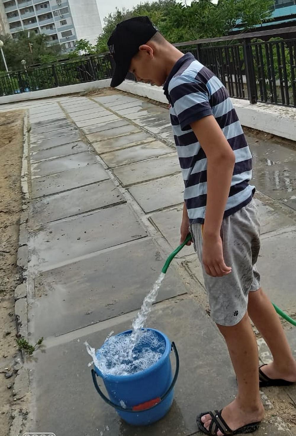 За их домом, как говорит Айдар, идёт стройка, где используют воду из шланга. Он решил обратиться с просьбой к прорабу, который согласился и предоставил ему шланг.
