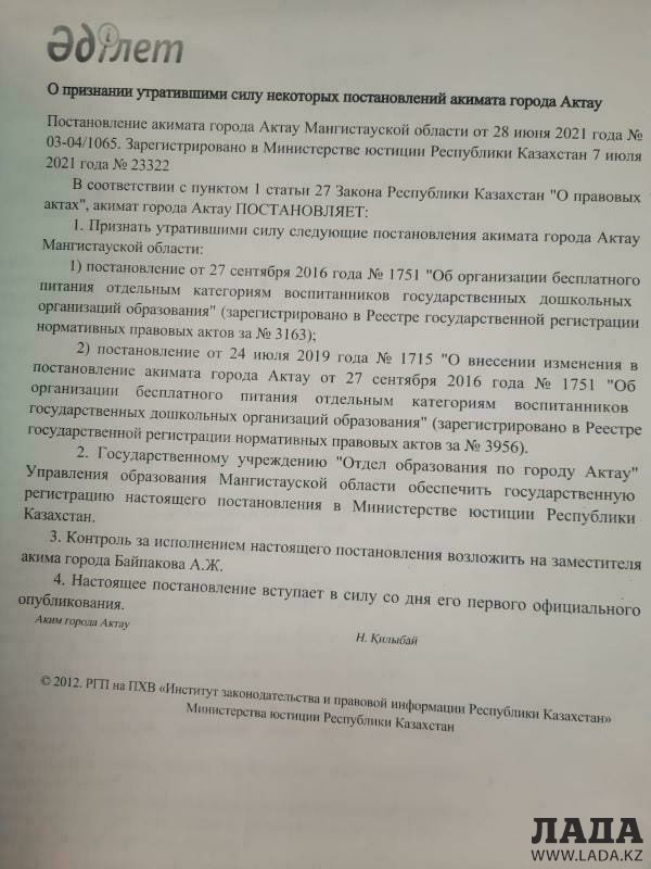 В редакцию Lada.kz обратилась жительница Актау, которая сообщила о новом постановлении акимата, в котором говорится об отмене льгот на питание в детских садах Актау.