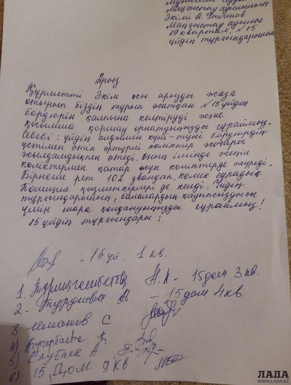 По словам сельчан, перед домом №15 на улице Мангышлакская, у средней школы №1, постоянно передвигаются автомобили. Придомовую территорию превратили в автопарковку. Так продолжается на протяжении года.