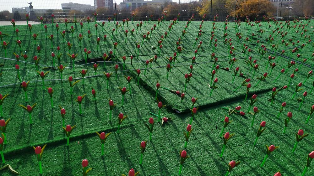 Журналист Lada.kz сфотографировал пластиковые тюльпаны 24 октября. Часть из них оказались надломлены.