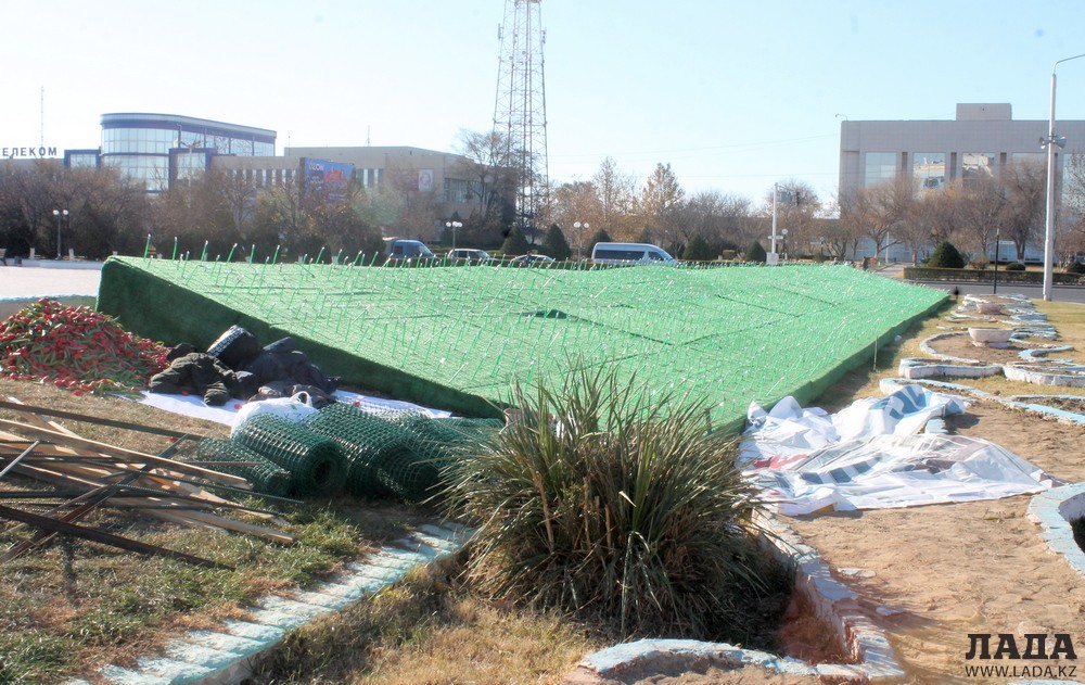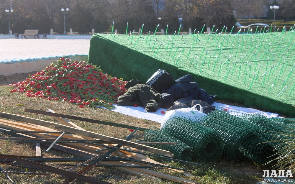 Жители Актау начали сообщать сегодня, 14 ноября, о начале демонтажа пластиковых тюльпанов на площади «Ынтымак».