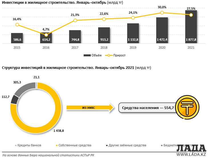 В общей сложности за 10 месяцев текущего года в строительство жилья было проинвестировано 1,9 триллиона тенге, что на 27,5 процента больше, чем в январе–октябре 2020-го. При этом из общего объёма выделенных средств 76,6 процента приходится на собственные средства бизнеса (застройщиков). Из них 554,7 миллиарда тенге или 38,6 процента, — средства населения, в том числе средства, выделенные на долевое строительство.