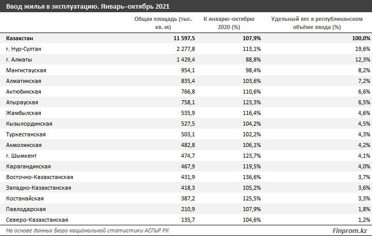 Finprom.kz, в стране было введено в эксплуатацию 11,6 миллиона квадратных метра жилья, что почти на восемь процентов больше по сравнению с аналогичным периодом прошлого года.