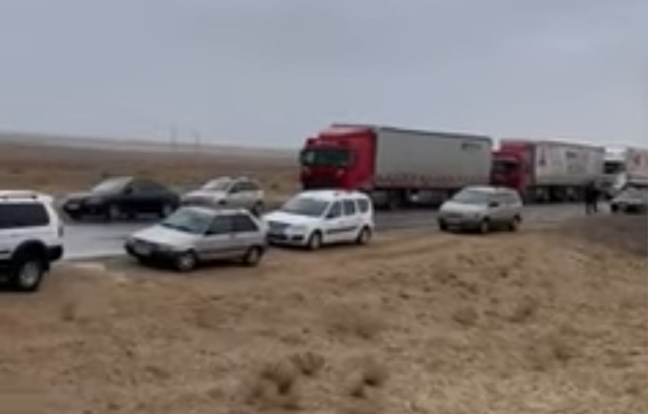 Дорогу в сторону поселка Курык перекрыли. На кадрах видео, которое появилось в Сети, видно скопление людей и машин.