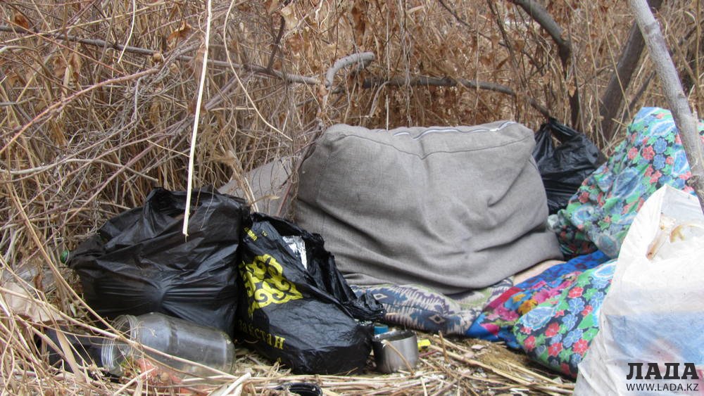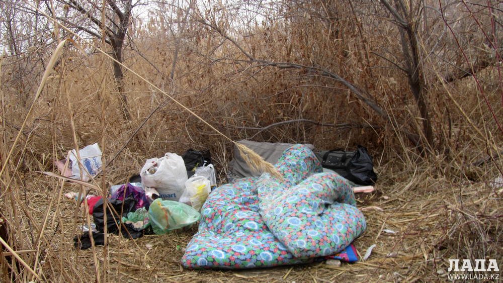 Ночлежка бездомного молодого мужчины находится среди кустарников и камышей на берегу Каспия.