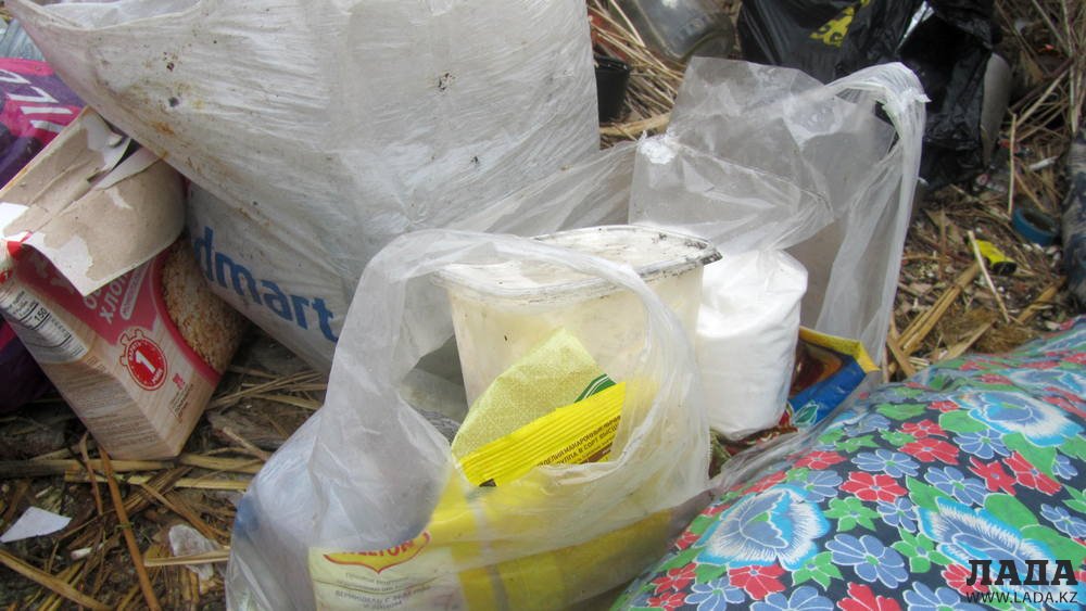 Здесь же упаковки с остатками макарон, овсяных хлопьев, сметаной и других продуктов.
