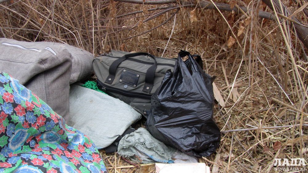 В кустах лежит одеяло, напоминающее спальный мешок, две подушки и сумка с вещами.