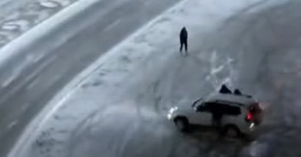 На видео за «Toyota Land Cruiser Prado» закрепились несколько человек и водитель внедорожника устроил дрифт.