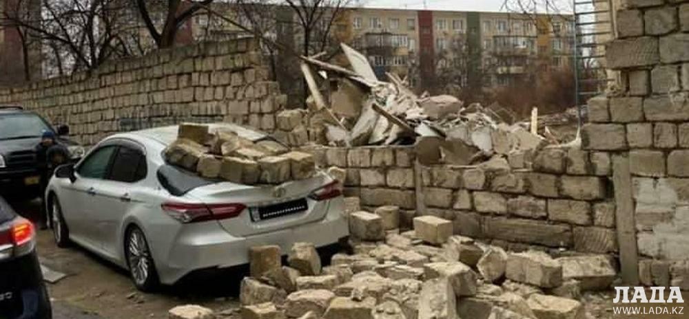 Кирпичный забор обрушился на припаркованный рядом автомобиль. Очевидцы предполагают, что старое строение не выдержало сильного ветра.