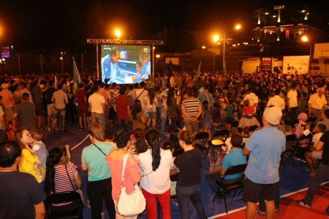 На открытой баскетбольной площадке «DOMA DOMA Street Court» болельщики в прямом эфире наблюдали поединок Ниязымбетова и Ла Круса. На набережной собрались любители и ветераны бокса, спортсмены, представители областного акимата. Поболеть за Адильбека пришли глава Мангистауской региона Алик Айдарбаев и отец боксера Сабит Ниязымбетов.