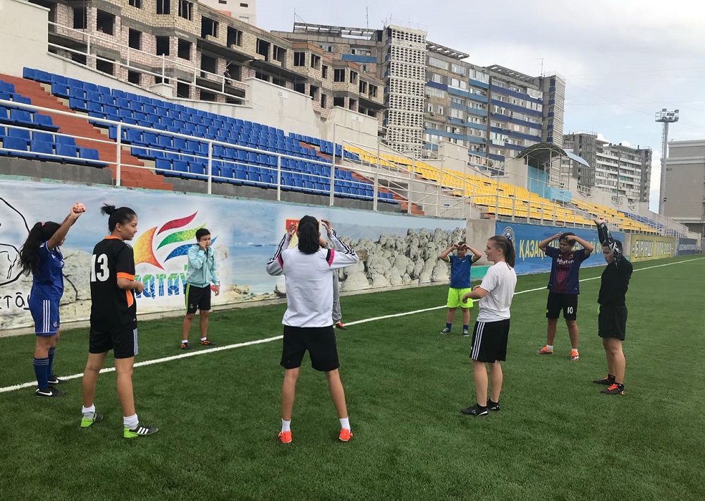 Женская команда СДЮШОР по футболу провела первую тренировку на поле. Как сообщает Айнди Джумаев, это было сделано для того, чтобы узнать недочеты газона до открытия стадиона.