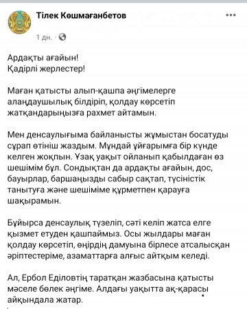 - Я написал заявление на увольнение по состоянию здоровья. К такому решению я пришел не сразу. Это мое решение, которое я принял после долгих размышлений. Поэтому, дорогие братья, друзья, призываю всех вас сохранять спокойствие, проявить понимание и отнестись с уважением к моему решению. Мы не будем уклоняться от служения стране, если здоровье улучшится. Хочу поблагодарить своих коллег и горожан, которые поддерживали меня и участвовали в развитии региона в эти годы. А вопрос, связанный с заметкой, распространенной Ерболом Едиловым, это отдельная история. В будущем все встанет на свои места, - сообщил бывший аким Мангистауского района.