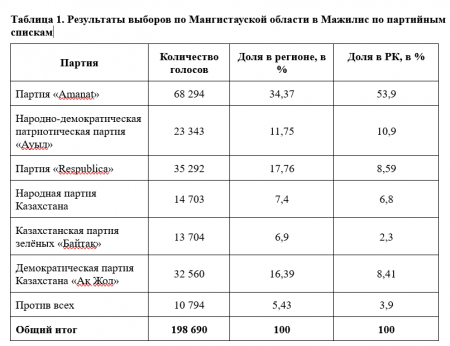 Данные по количеству голосов взяты из сообщения центральной избирательной комиссии (ЦИК) РК об итогах внеочередных выборов депутатов Мажилиса Парламента Республики Казахстан восьмого созыва и не учитывают количество испорченных избирателями бюллетеней.При этом по сообщению Мангистауской избирательной комиссии в списки избирателей были включены 412 183 жителя области. В голосовании за депутатов в областной маслихат приняли участие 222 251 избиратель, в том числе по открепительным удостоверениям – 142, вне помещений для голосования – 283.
