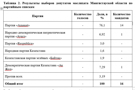 Отметим, что Мангистауской избирательной комиссией не представлены итоговые данные по абсолютному количеству голосов за каждого кандидата-одномандатника в областной маслихат. Приведены только доли голосов избирателей, отданных за кандидата.