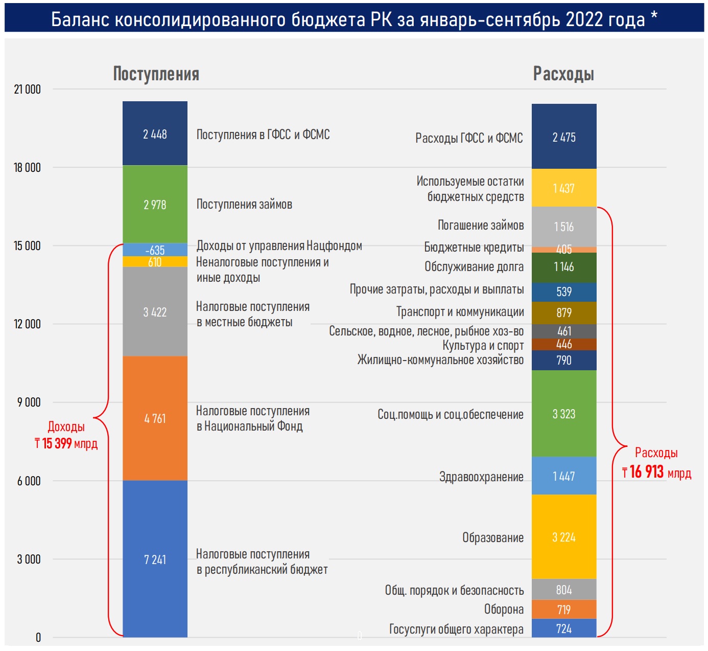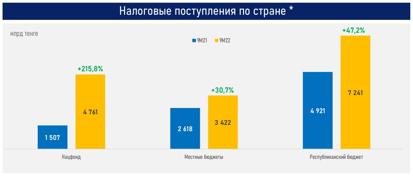 За январь-сентябрь 2022 г. было собрано ₸15,4 трлн налогов, что на 71% или ₸6,4 трлн выше в сравнении с аналогичным периодом прошлого года.