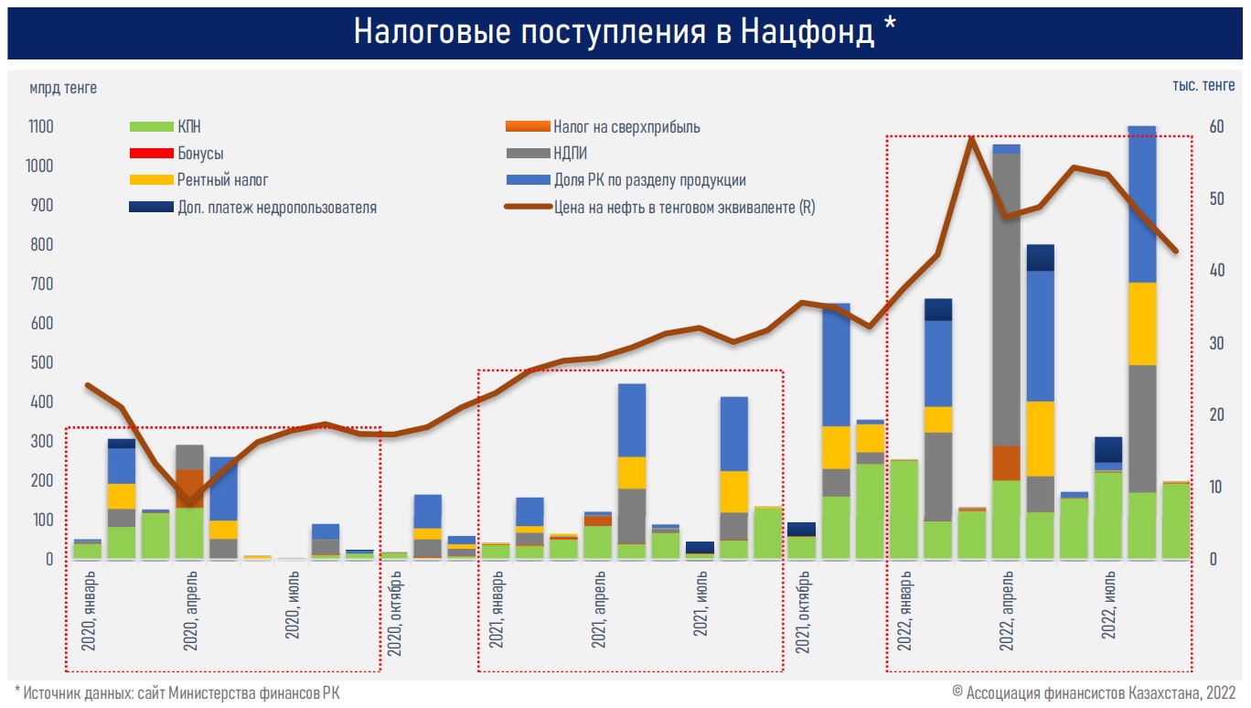 Более высокие цены на нефть и курс USDKZT относительно заложенных в бюджет ориентиров (90 долл. за баррель, 460 тенге за доллар) в сочетании с положительной динамикой экономического роста обусловили значительное улучшение налоговых поступлений.
