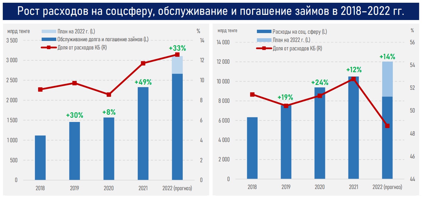 Основная часть указанного прироста (59% или ₸1,6 трлн) приходится 3 статьи: образование (+₸652 млрд), обслуживание и погашение долга (+₸648 млрд), соцпомощь и обеспечение (+₸308 млрд).
