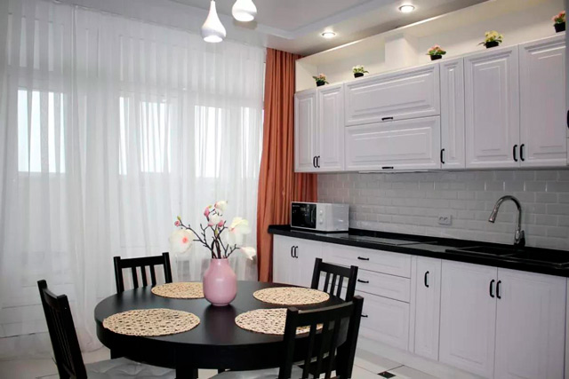 Пятое место заняла двухуровневая квартира за 400 тысяч тенге в месяц площадью 110 квадратных метров. Она находится в жилом комплексе «Изумрудный» в 14 микрорайоне. На первом уровне расположены холл, кухня, гостиная-зал, спальня, санузел, душевая кабина с сауной и ванна-джакузи, на втором - вторая спальня, санузел и гардеробная. Квартира с евроремонтом, укомплектована мебелью, бытовой техникой, посудой, постельными принадлежностями. Имеются бойлер, стиральная, сушильная и посудомоечная машины. Парковка для автомобилей жильцов бесплатная и охраняемая. Работает видеонаблюдение придомовой территории и в подъезде. Это единственная квартира в списке, в стоимость аренды которой входят коммунальные услуги.