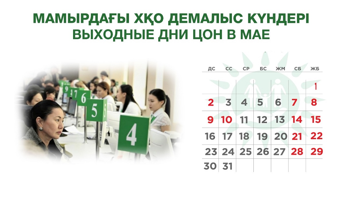 «1, 2 мая - ЦОНы не будут работать в связи с празднованием Дня единства народов Казахстана. С 3 по 6 мая - рабочие дни. День защитника отечества и День Победы 7, 8, 9, 10 мая - также будут выходными днями для сотрудников ЦОН по всей стране», - сообщили в госкорпорации.