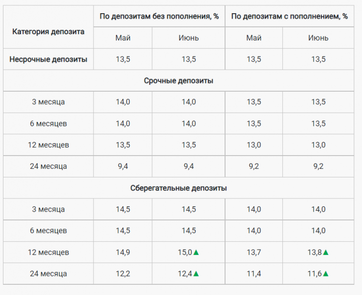 Максимальные ставки по несрочным, срочным и сберегательным депозитам на 3 и 6 месяцев, а также по срочным депозитам на 12 и 24 месяца остались без изменений и были сохранены на уровне майских значений.