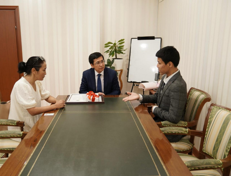 Министр вручил Есдаулету Даутбекову благодарственное письмо и памятные подарки. Также по ходатайству министра выпускнику предоставлен грант на бесплатное обучение в университете Нархоз в Алматы.
