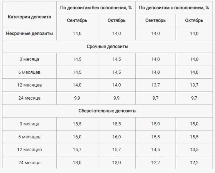 Ставки по всем видам депозитов физических лиц в национальной валюте остались без изменений и были сохранены на уровне сентябрьских значений.