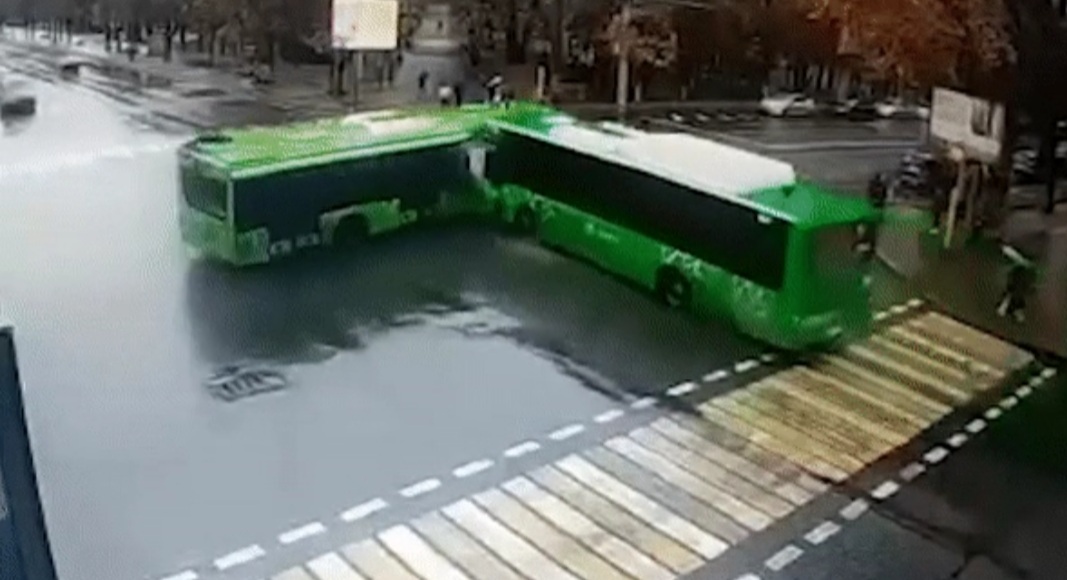 В соцсетях появились кадры ДТП, произошедшего на пересечении улиц Толе би и проспекта Абылай хана. Сообщается, что столкнулись два автобуса и есть пострадавшие среди пассажиров.
