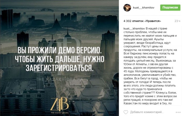 "В нашей стране столько проблем, чтобы мне их перечислить не хватит моих пальцев и пальцев моих друзей. Ауылы умирают, везде безработица, идут сокращения. Растут цены на продукты, на коммунальные услуги, на все! Бедному пенсионеру попасть на камеру за рулем, ему придется голодать целый месяц. Выезжаешь за 100 километров от Алматы, совсем другая жизнь, дороги не отремонтированы с 45 года. Молодежь превращается в алкоголиков, увеличивается убийство, грабеж. Все бегут в город, чтобы не умереть от голода! И теперь после всего этого, эти люди должны платить за то что куда то приехали в собственной стране??? Клянусь богом, того кто придет ко мне с этим вопросом регистрации, я похороню его там же! Казахстан по миру входит в пятерку по нефти, газу, золоту, серебру, урану, меди, алюминию, углю и т.д. Народ и так не видит их! И после всего этого вы хотите грабить простой народ своими МРП??? Патриот не тот кто кричит больше всех "Алга Казахстан", а тот кто чувствует боль своего народа! Столько проблем в нашей стране, а они придумали закон МРП", - написал он на своей странице в Instagram (орфография и пунктуация в основном сохранены).