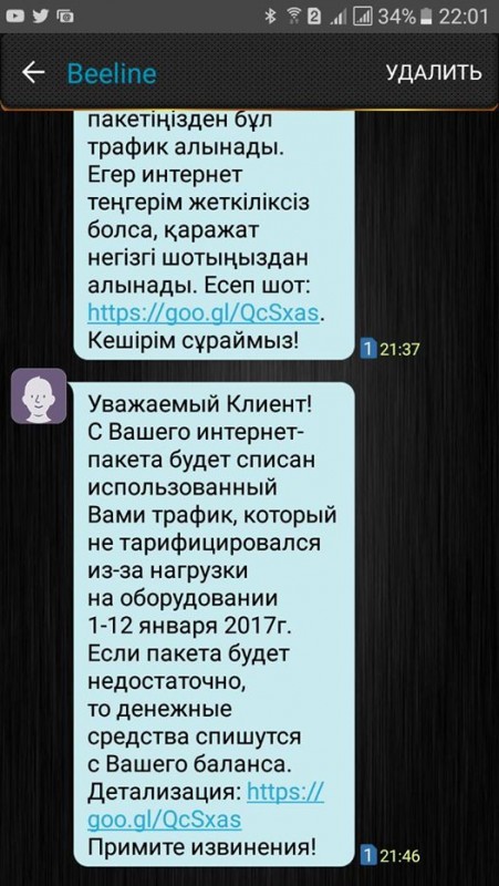 "В эти новогодние праздничные дни абоненты поставили абсолютный рекорд в пользовании мобильного Интернета, сеть Beeline с нагрузкой успешно справилась, предоставив абонентам высококачественный сервис. Однако из-за большой нагрузки часть трафика была не протарифицирована, но абоненты им воспользовались. Так как тарификация этой части трафика будет проходить в ближайшие несколько дней, мы заблаговременно провели информационную SMS-рассылку абонентам", - сказали в Beeline.