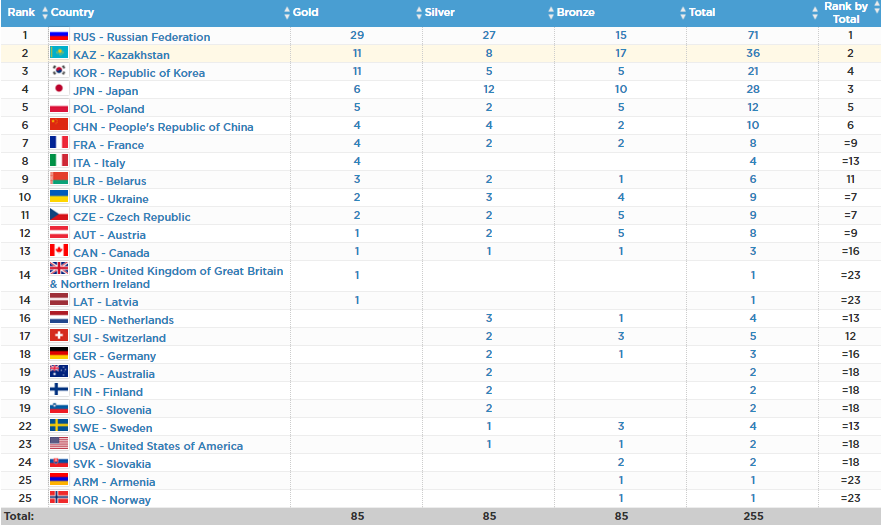 По итогам всех соревнований в копилке национальной сборной 36 медалей: 11 золотых, восемь серебряных и 17 бронзовых.
