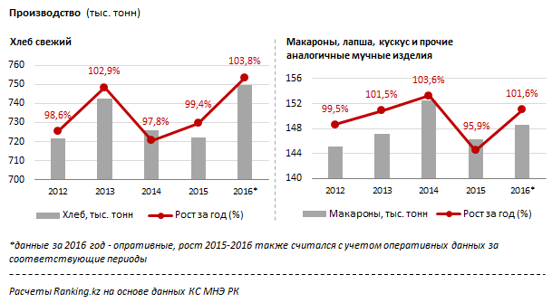 По итогам 2016 года производство свежего хлеба в РК достигло рекордных 749,7 тыс. тонн, на 3,8% больше, чем в 2015 году, когда отмечался спад. Главной «хлебницей» страны остается ЮКО — доля региона выросла до 23,8%, против 20,9% годом ранее, объемы выпуска подскочили на 17,9%, до 178,2 тыс. тонн. На этот же регион пришлись и максимальные объемы выпуска кондитерских изделий длительного хранения — 21,2 тыс. тонн, +35,1% к 2015 году (это 22,4% от всего производства подобных изделий по РК).