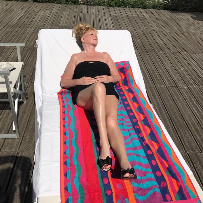 На кадре 68-летняя певица одета в черный купальник без бретелек. Волосы Пугачевой собраны наверх, а на ногах красуются черные шлепанцы с бантиком.