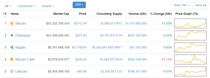 Также на скриншоте можно увидеть, что цена "альтернативного биткоина" (Bitcoin Cash) продолжает неуклонно снижаться. Напомним, менее месяца назад биткоин впервые преодолел отметку в 3 тысячи долларов. А несколько дней назад биткоин разделился на две криптовалюты и упал в цене.